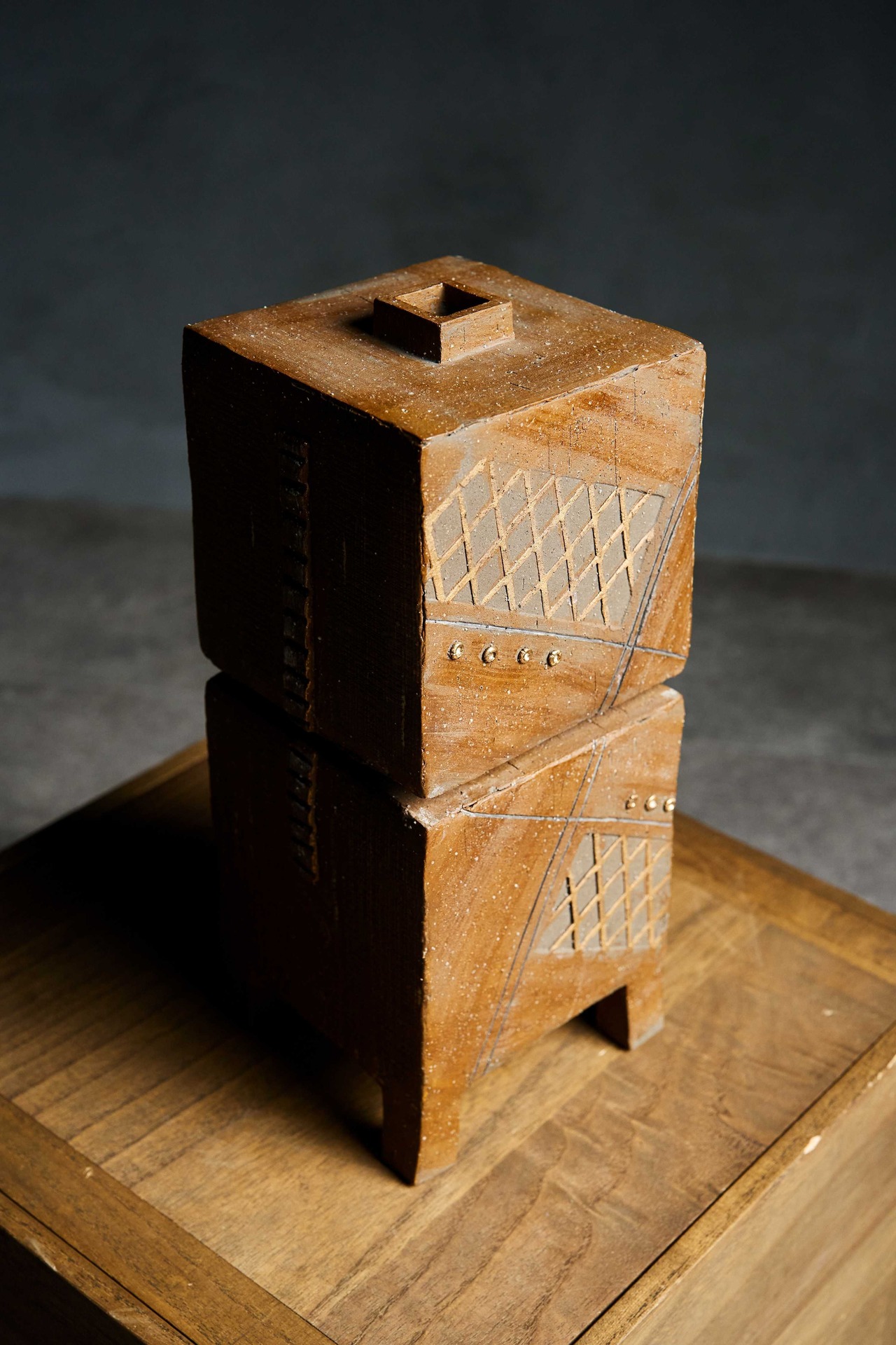 「ロボロボ」は、無骨なフォルムと幾何学的な装飾が融合した陶のオブジェです。表面に刻まれた格子模様と金属的な装飾は、古代の遺物にも、未来都市のロボットにも見える不思議な魅力を持ちます。