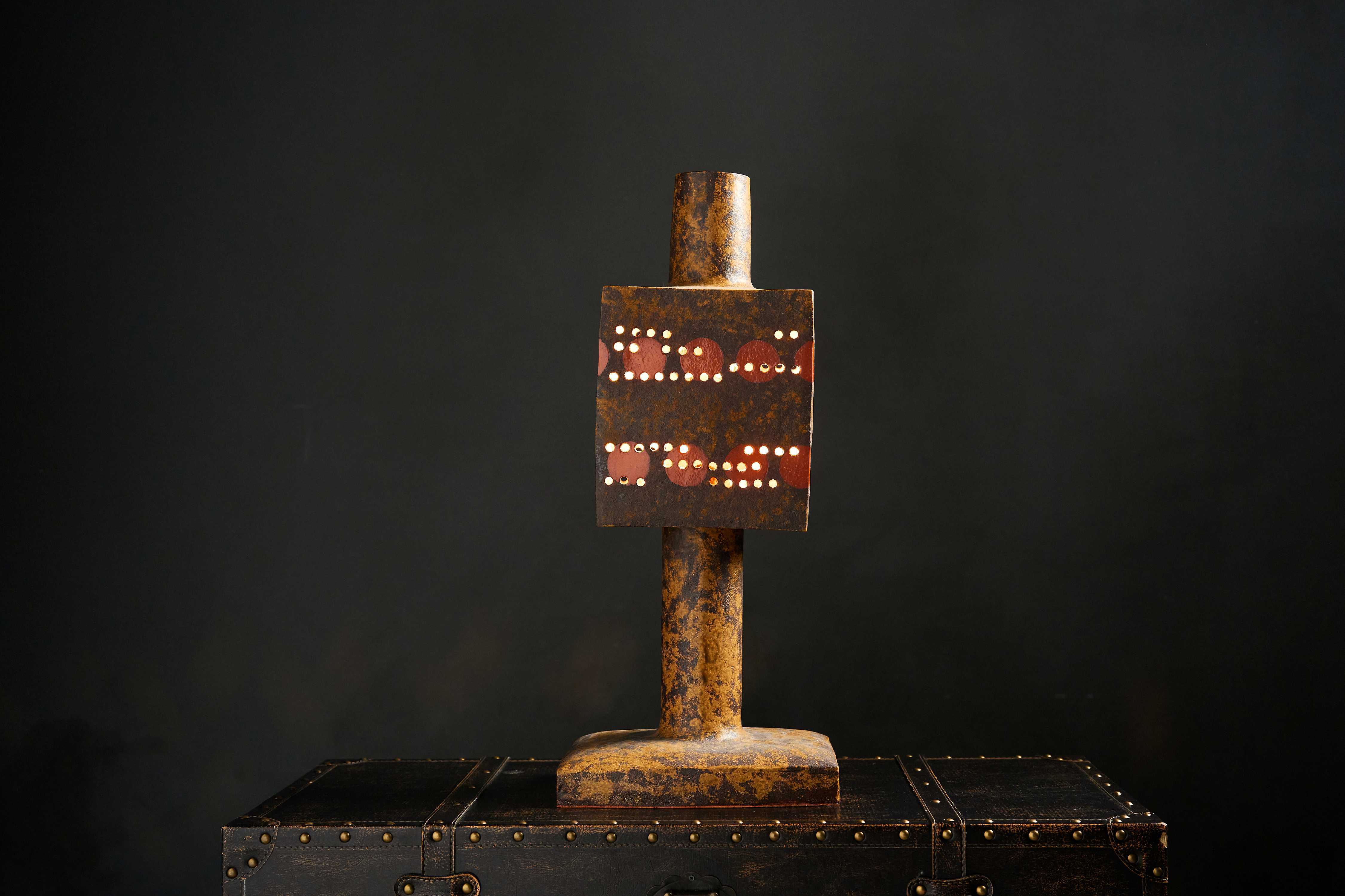 灯りを透かすと、温かな輝きが褐色の地肌に滲み、空間全体をやわらかく包み込みます。