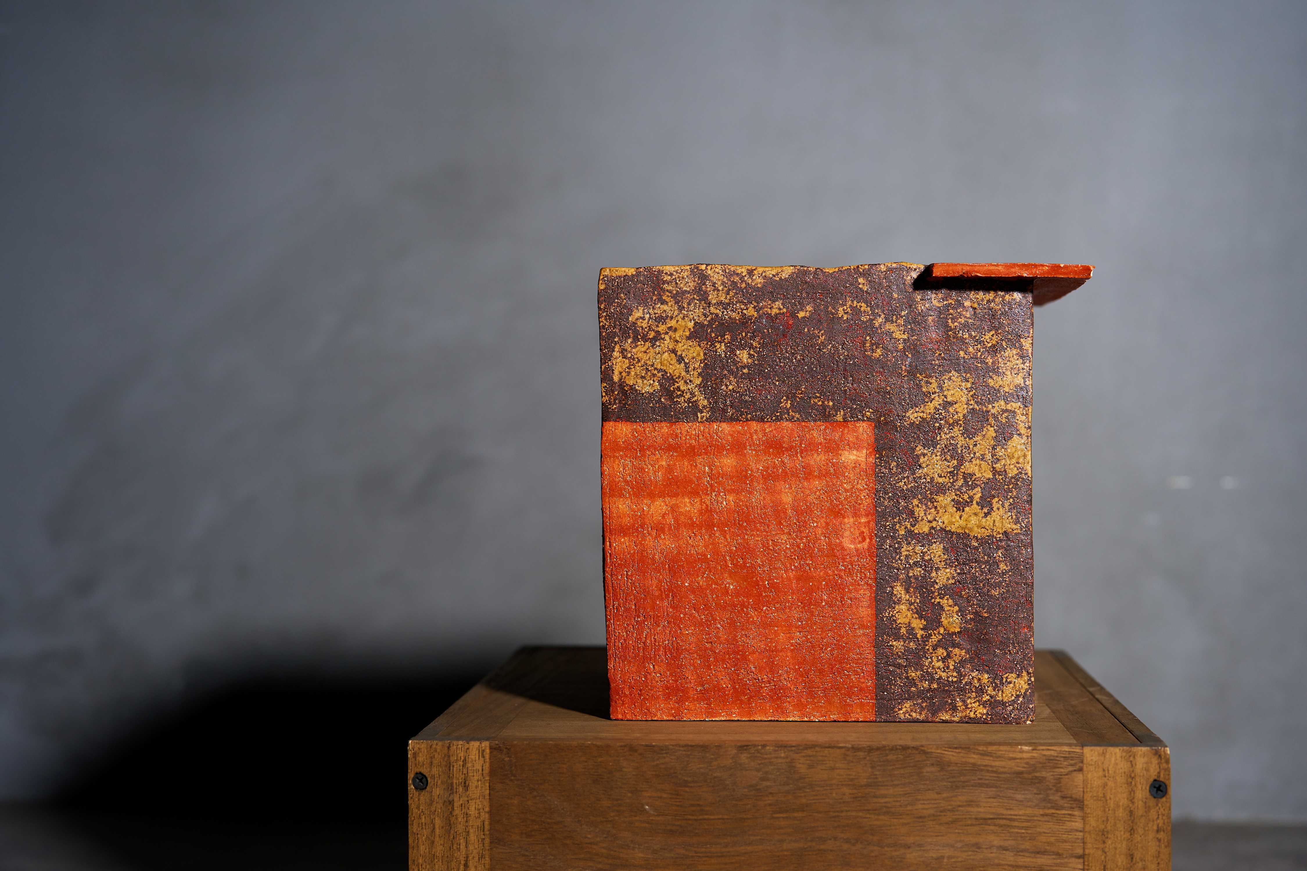 「飛べたらいいのに」の深みのある赤と褐色が重なり合う面は、大地と空、現実と憧れの境界を映し出します。立方体の端に今にも踏み出せそうな小さな飛び込み台が構えるように、どこか遠くへと羽ばたこうとする翼のよう。