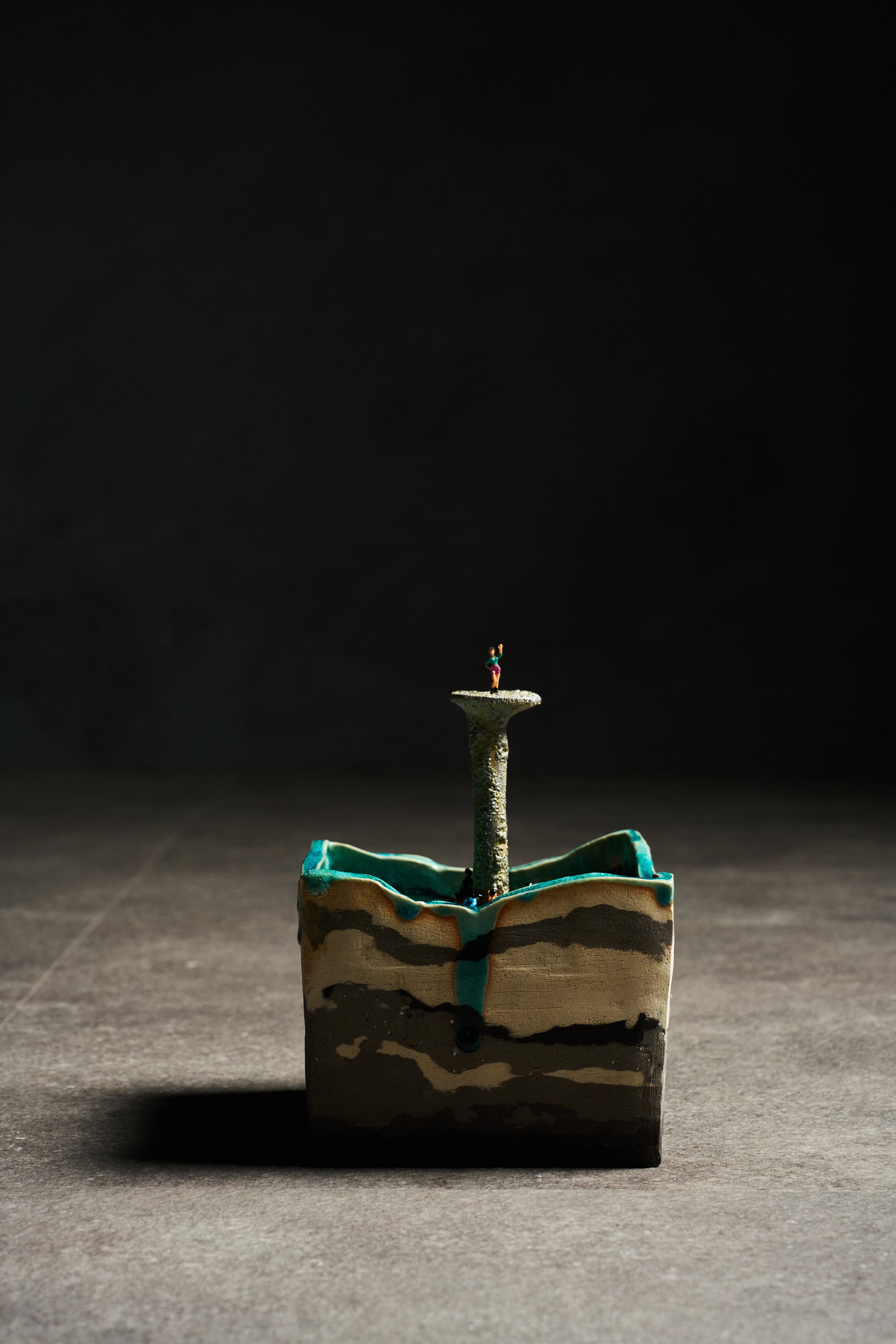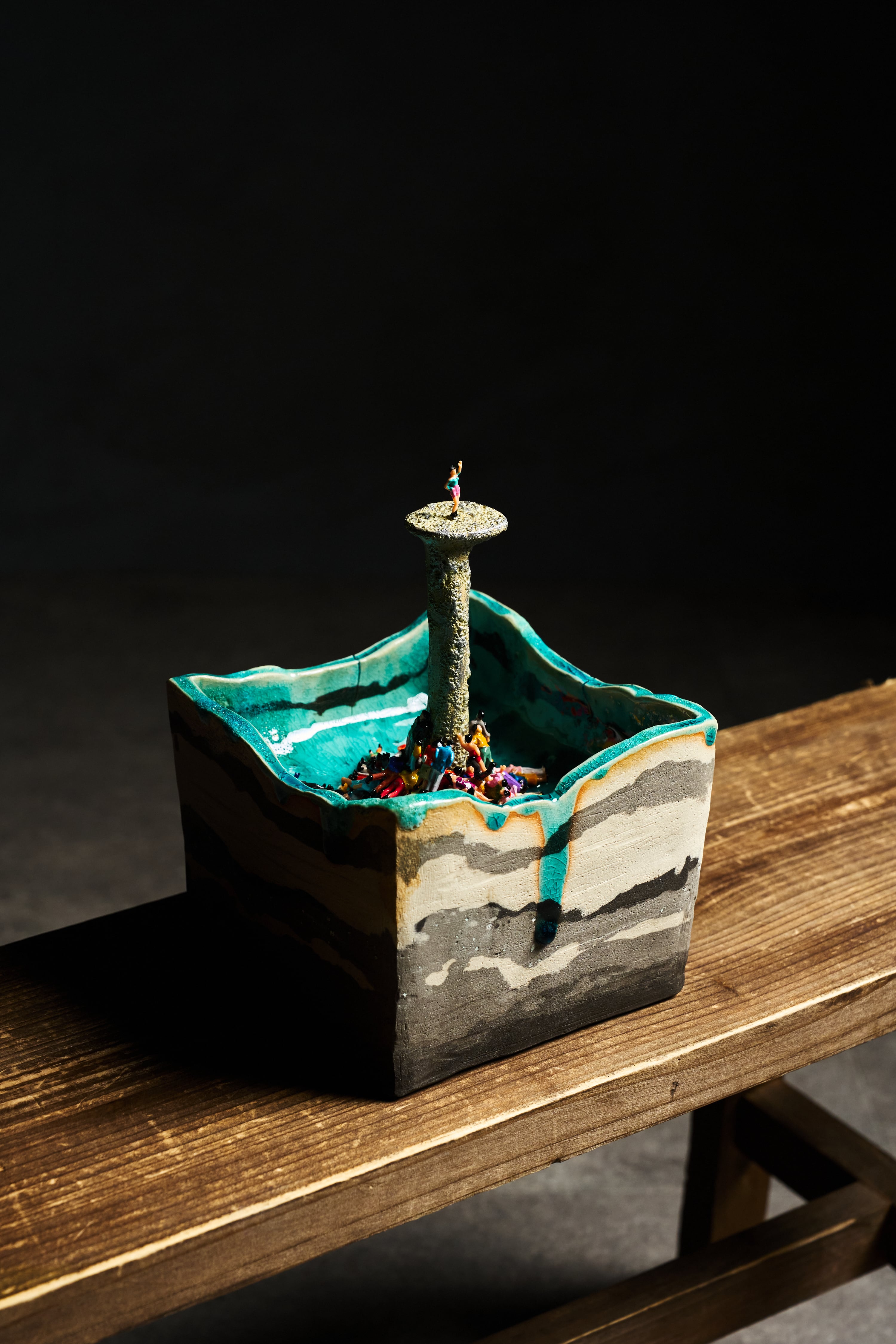 この作品は、重なり合う陶の質感の中から一本の杭がまっすぐに突き抜け、その頂点に立つ小さな人影が強い印象を残します。足元に集う群衆との対比はユーモラスでありながら、見る人それぞれの物語を呼び起こします。