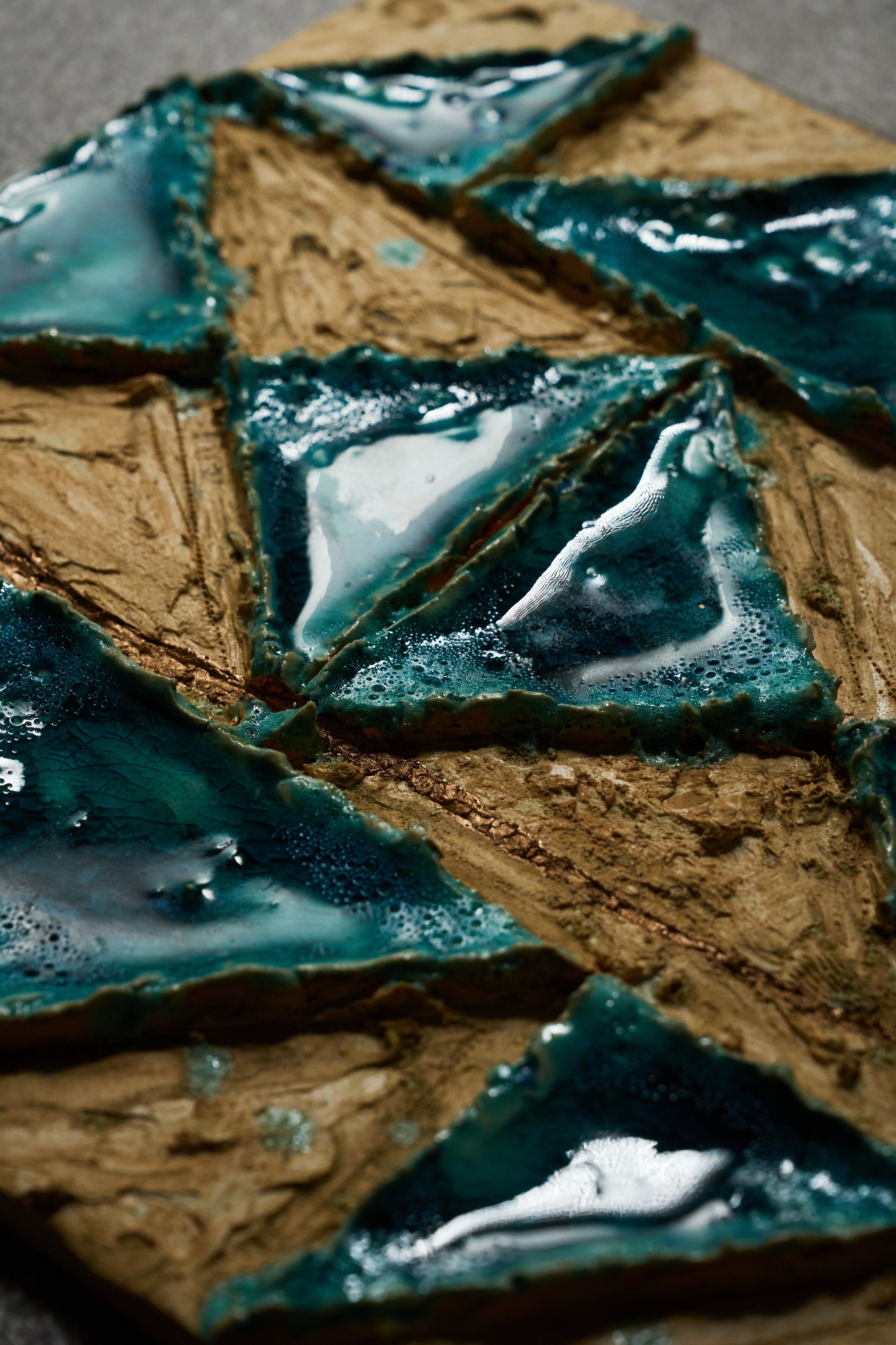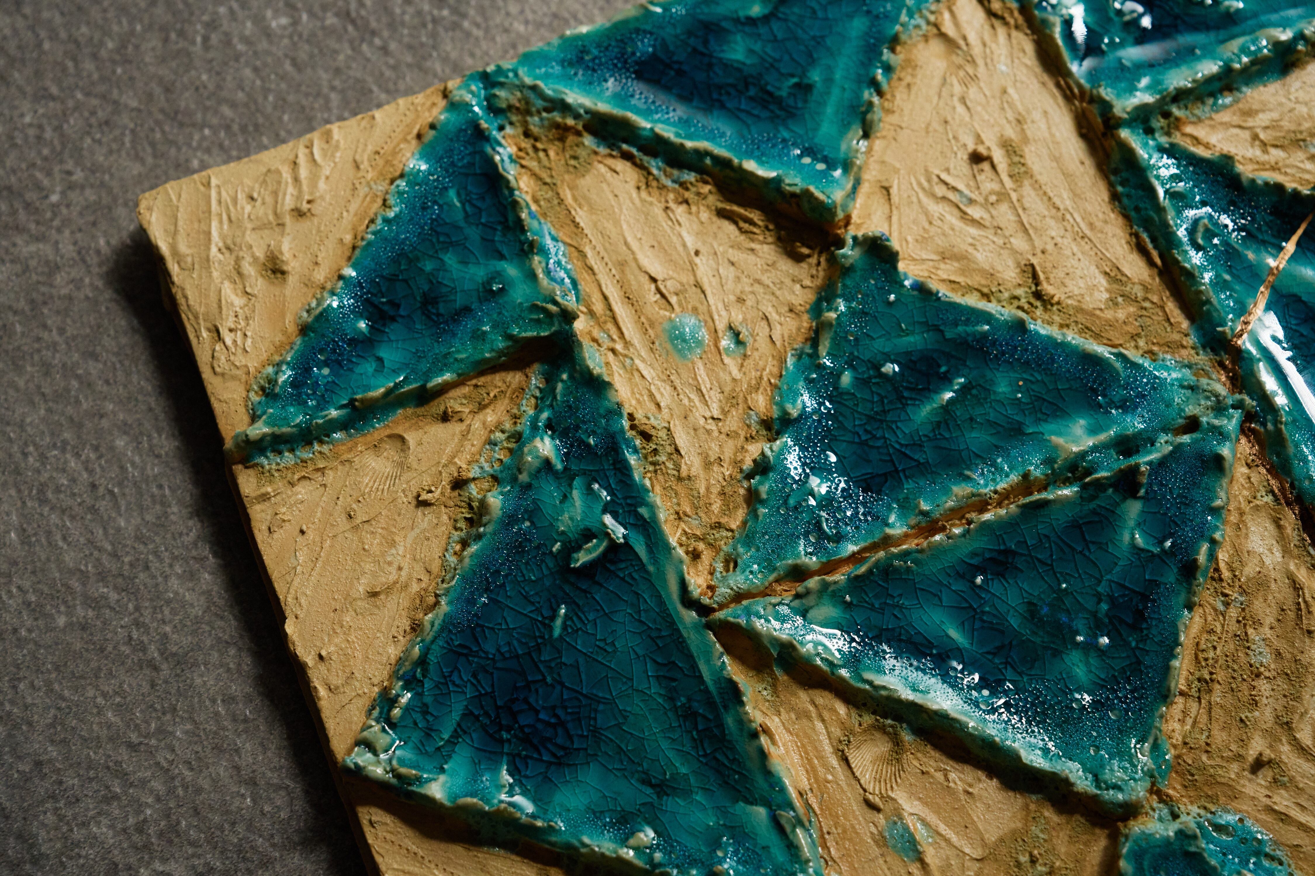 ひとつひとつの面が光を受けて変化し、見る角度によって、海面のように異なる表情を見せます。